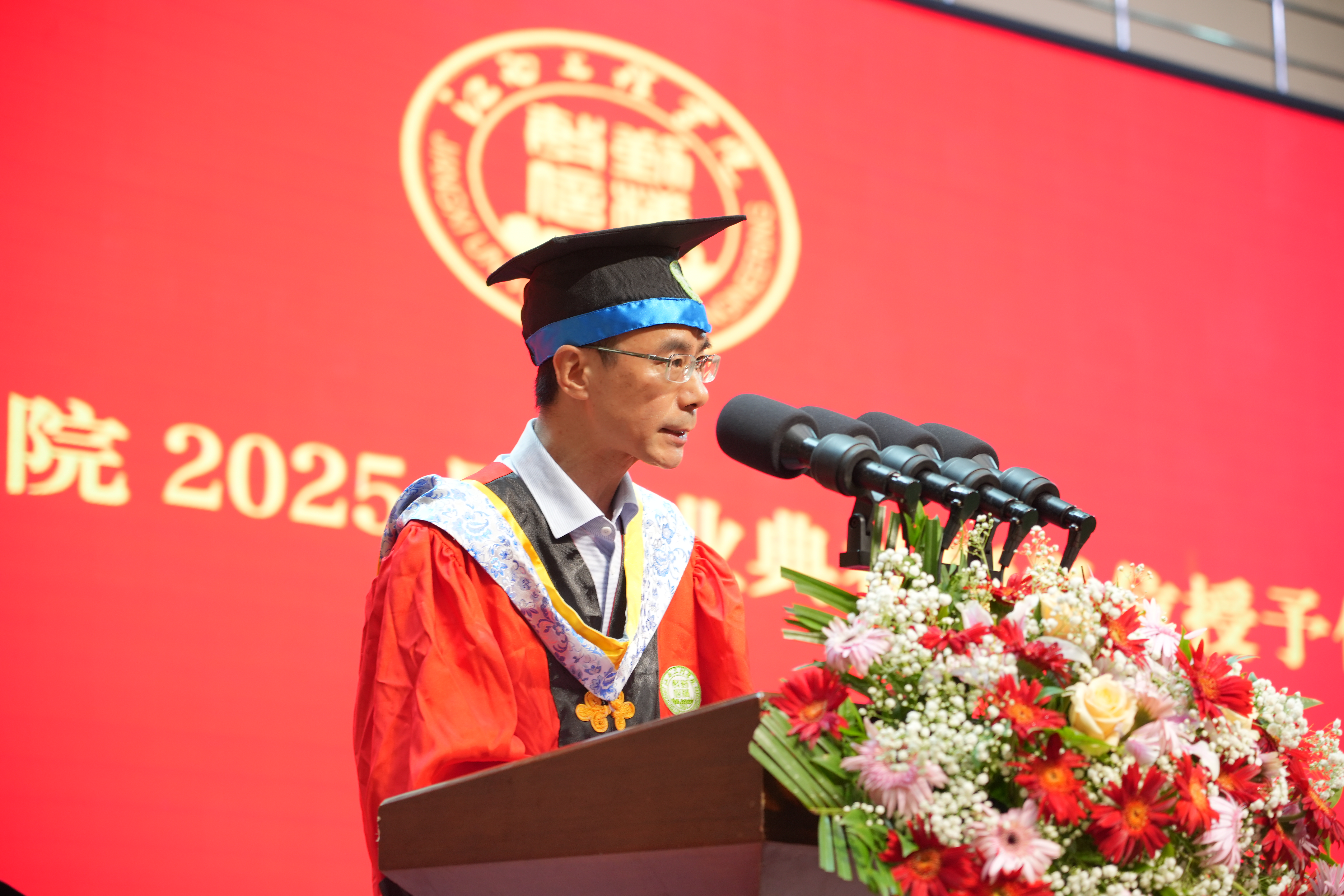“铭记校训,发扬精神。愿你们如骏马般在草原奔腾,以坚韧与勇气面对风雨,奔向星辰大海。”“胸怀家国,勇担使命。愿你们始终心系国家、心怀人民,把个人理想融入民族复兴的伟业中。”智能制造与建造学院刘艳华作为教师代表致辞,表达了对毕业生的美好祝福。寄语饱含师者仁心,既有学术传承的厚重,又有人文关怀的温度,为毕业生上了最后一堂生动的人生课。