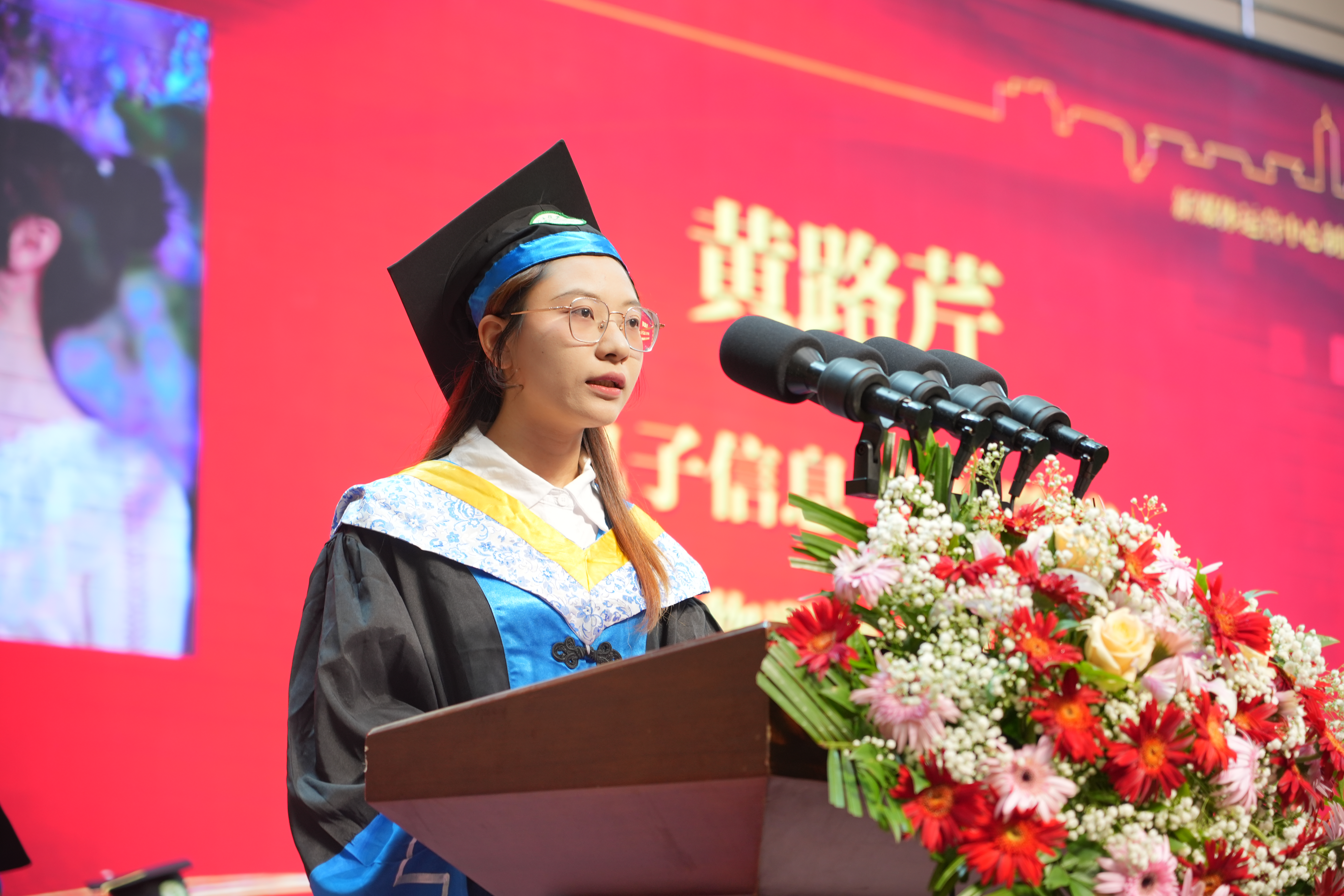 毕业生代表、电子信息工程学院2021级物联网工程本科2班黄路芹深情回顾了在母校求学的珍贵岁月,并表示将以“勤朴敏信”校训精神激励自己开启人生新征程,用所学所知回应时代之问,用拼搏与奋斗书写青春答卷。她希望学弟学妹们心怀梦想、坚守初心,始终保持终身学习的热情、勇于承担社会责任,为推动社会进步贡献江工人的智慧和力量。