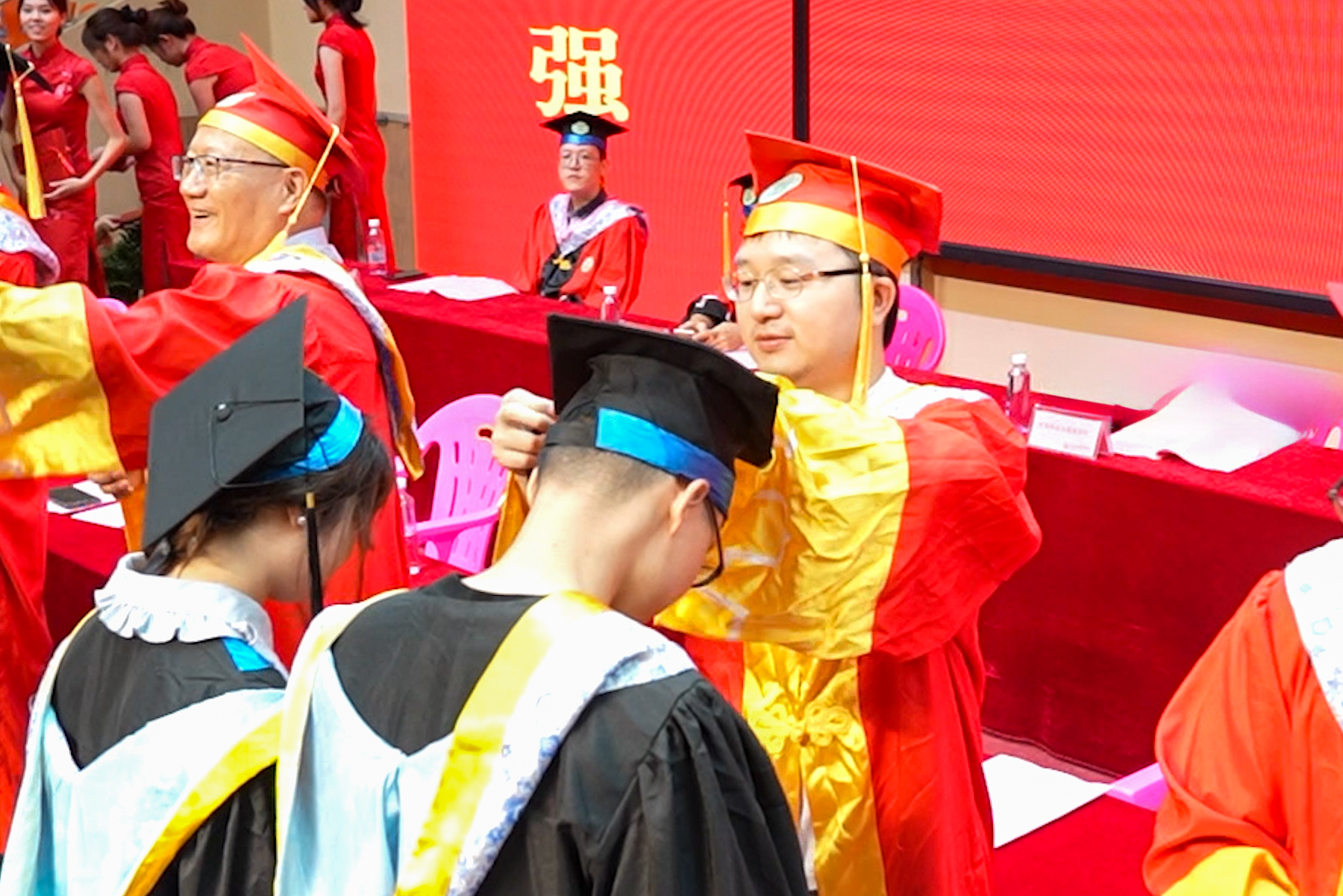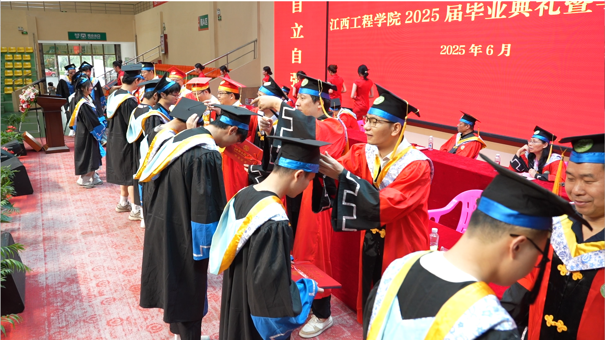 拨穗正冠,仪式感拉满。伴着现场欢快的旋律,2025届毕业生身着学位服有序上台,一张张青春的面庞洋溢着自信的笑容,他们从校领导手中接过写满深情寄语的纪念卷轴,并将帽檐微倾,一一接受拨穗礼。一批摄影师在台下用快门定格一个个美好瞬间。