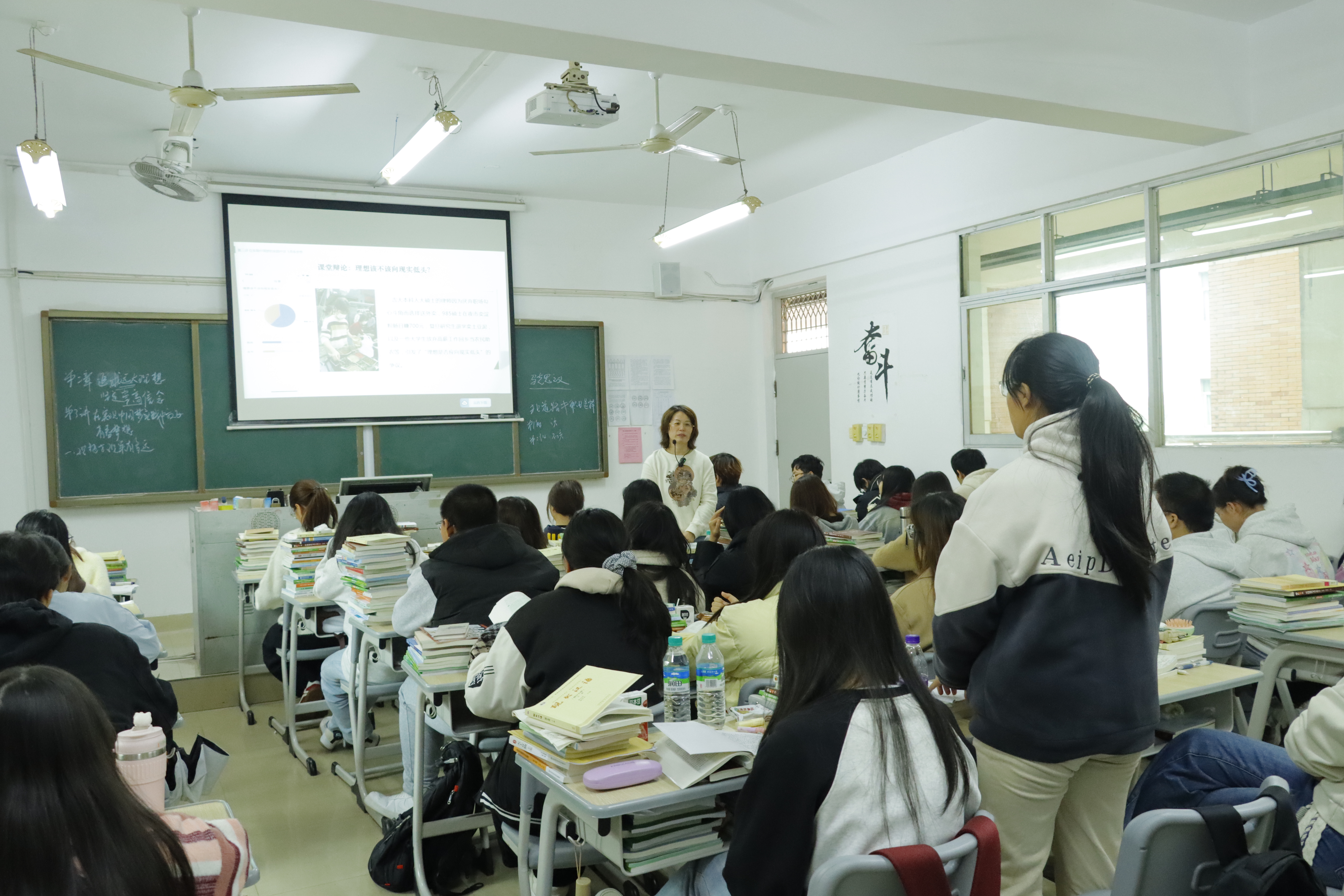 课堂现场呈现出浓厚的思辨氛围。占顺霞老师以“追求远大理想坚定崇高信念”为主题,系统讲解了理想信念的内涵价值、实践路径以及与中国梦的内在关联。教学中,她精准抛出“理想与现实的距离如何丈量?”“个人理想怎样融入社会洪流?”等直击学生困惑的问题,并以热门动画《浪浪山小妖怪》为案例,提炼出“当不了英雄也要守住心中微光”的育人触点,生动诠释了理想实现的长期性与必然性。