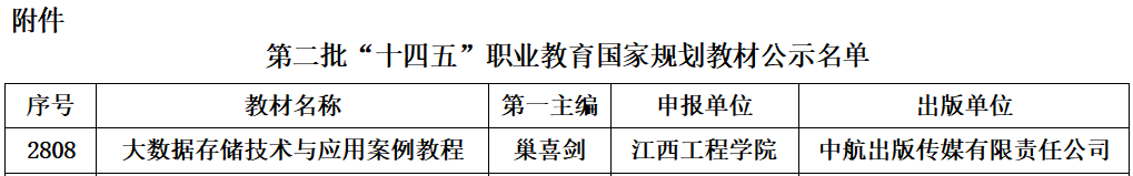 近日,教育部正式公示第二批“十四五”职业教育国家规划教材遴选结果。江西工程学院人工智能与数据科学学院巢喜剑教师团队主编的《大数据存储技术与应用案例教程》成功入选。这是学校首次跻身国家级规划教材行列,实现了教材类国家级标志性成果“零的突破”,标志着我校教育教学资源建设迈上新台阶。在此次遴选工作中,江西省同类本科高校仅2所院校的2部教材入选,江西工程学院赫然在列。