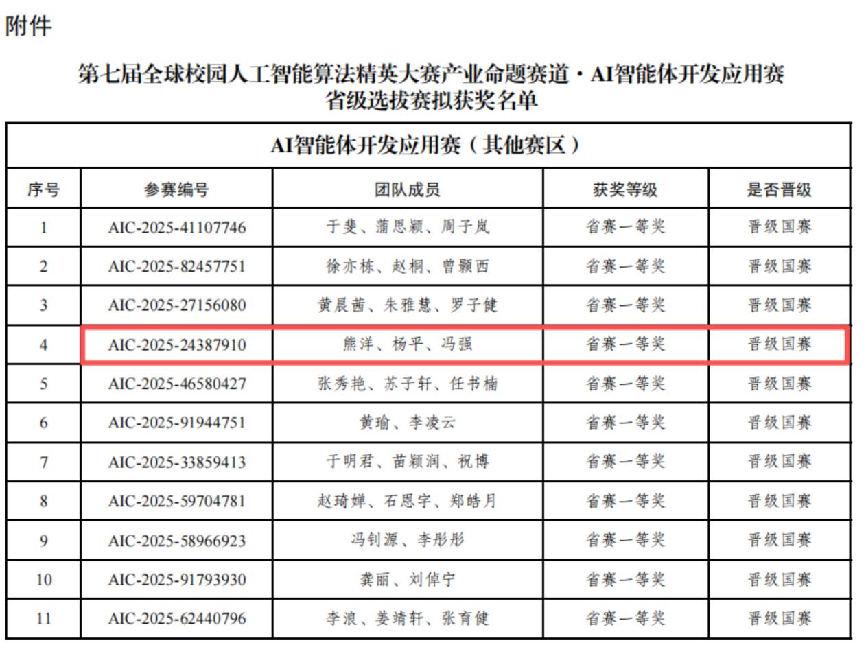 近日,2025年第七届全球校园人工智能算法精英大赛产业命题赛道·AI智能体开发应用赛省级选拔赛获奖名单正式公布。由江西工程学院科技处积极组织,在人工智能与数据科学学院郜永生老师的悉心指导下,参赛学生熊洋、杨平、冯强团队荣获省赛一等奖,并晋级国赛。
