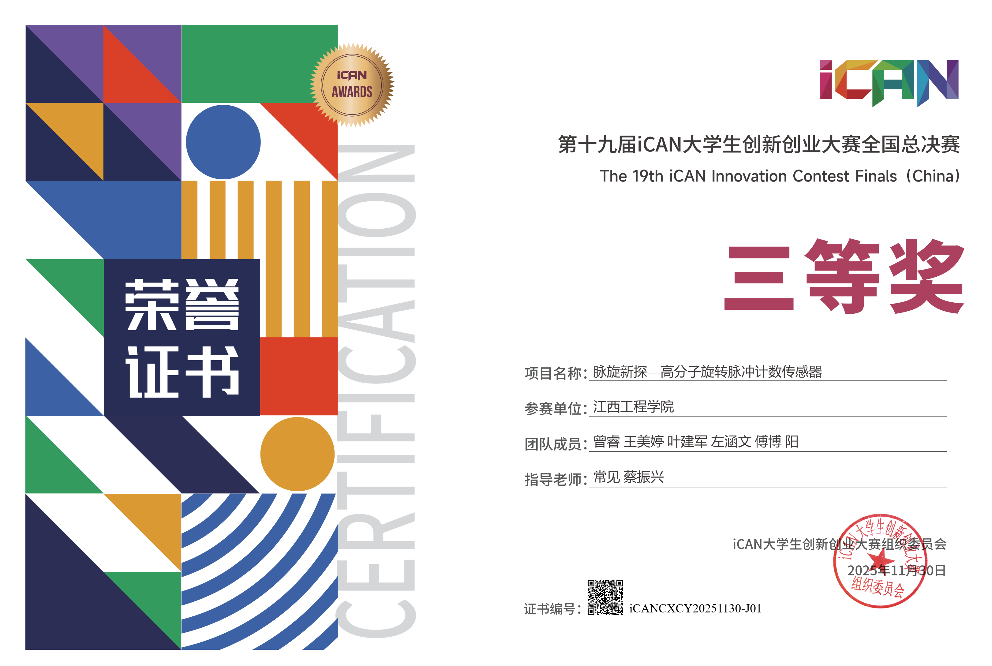 近日,2025年第十九届iCAN大学生创新创业大赛全国总决赛在杭州市萧山区钱江世纪城杭州国际博览中心圆满落下帷幕。经过激烈角逐,由江西工程学院曾睿同学领衔的“脉旋科技”团队斩获全国总决赛创新赛道三等奖。