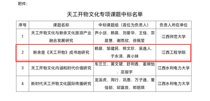 作为《天工开物》成书地的本土高校,江西工程学院自2016年成立天工文化研究院以来,构建了“课堂教学+科研研究+实践活动+校园环境”四位一体的育人体系,让天工文化成为滋养学生成长的精神沃土。在课堂教学中,学校将天工文化系统融入人才培养方案,出版《天工文化:传承与发扬》等著作;完成《天工开物文化与新余文化旅游产业融合发展研究》等省级相关课题研究。赖晨副教授牵头开展的天工文化专题讲座,三年间累计开设95场,覆盖1.2万人次。讲座通过分众化授课、情境化体验等创新模式,让“自强志气”转化为学生可感知、可践行的行为准则。